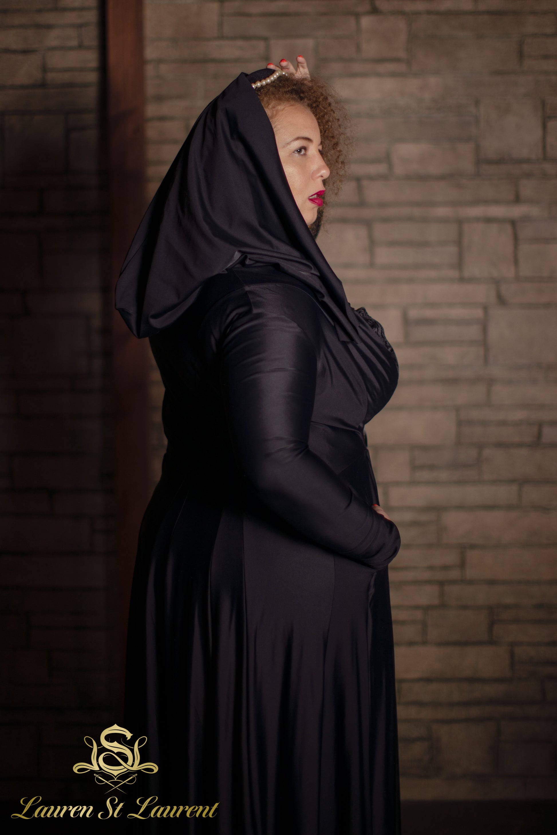 A floor length spandex cloak, made with high quality heavy matte spandex. GIANT hood is pleated into the neckline so you can be evil and cunning in the shadows. Beautiful pleating detail in the tight sleeves as well. There is a ribbon to tie at the waist, but a corset is the best way to secure it!