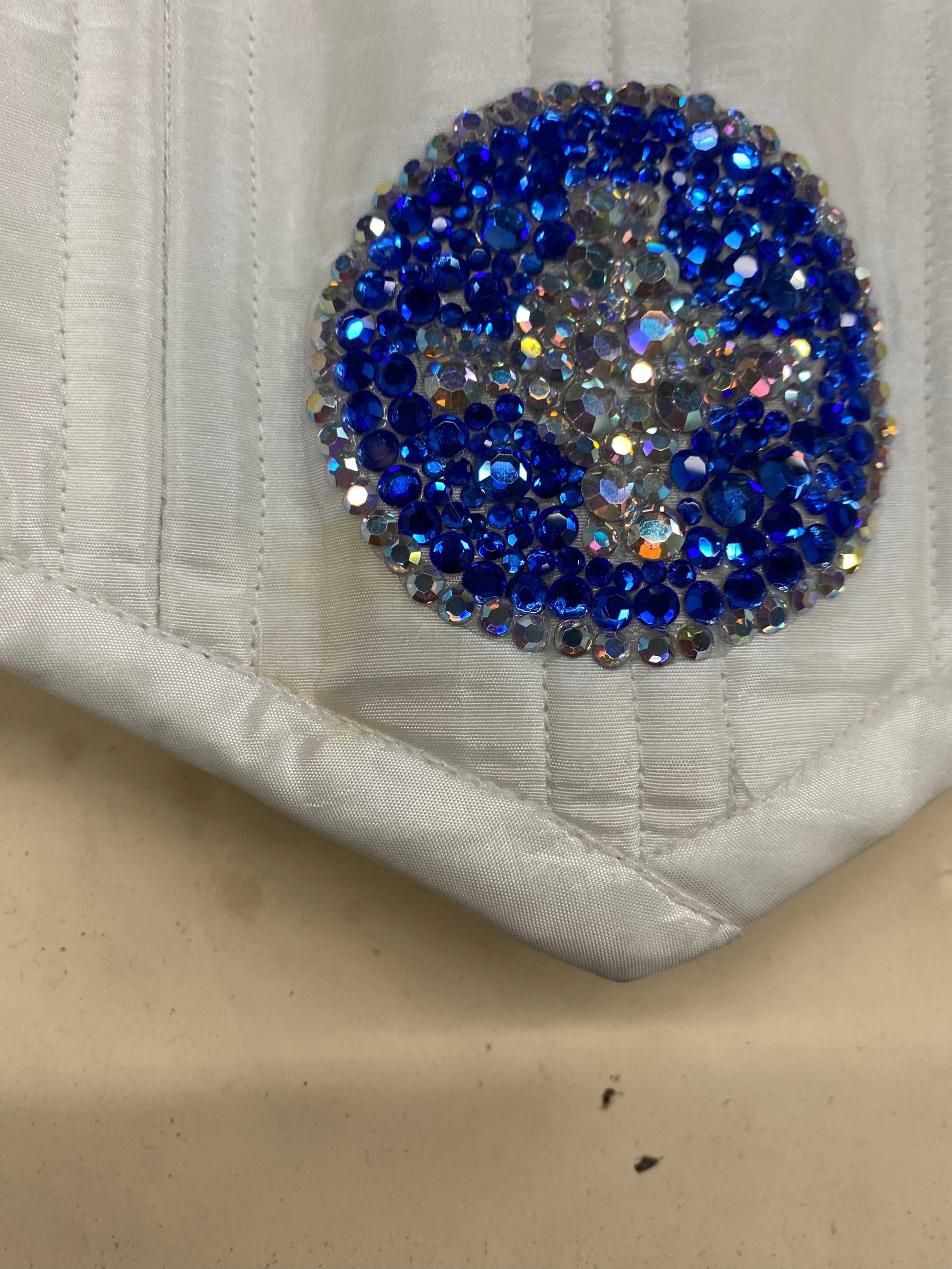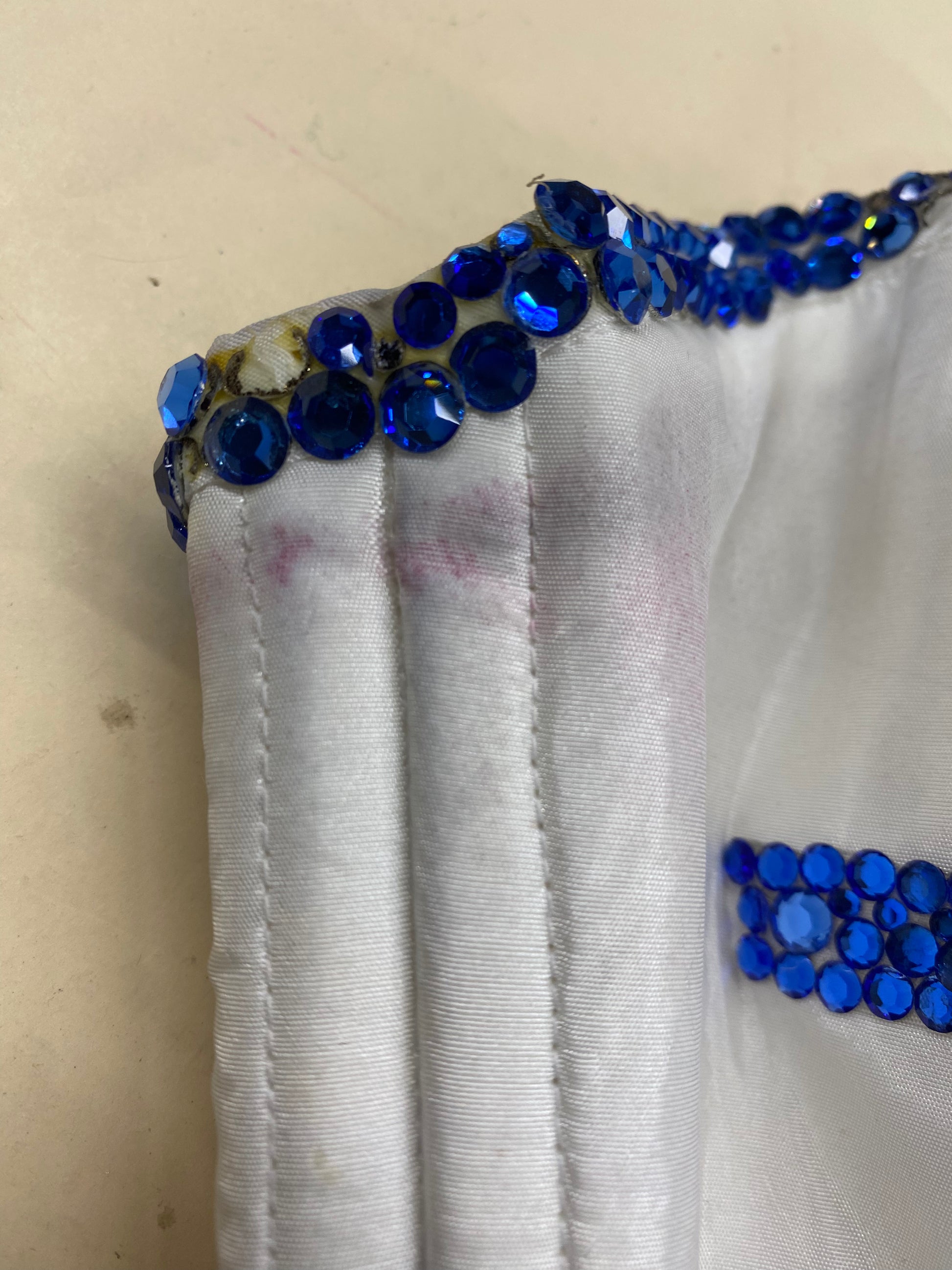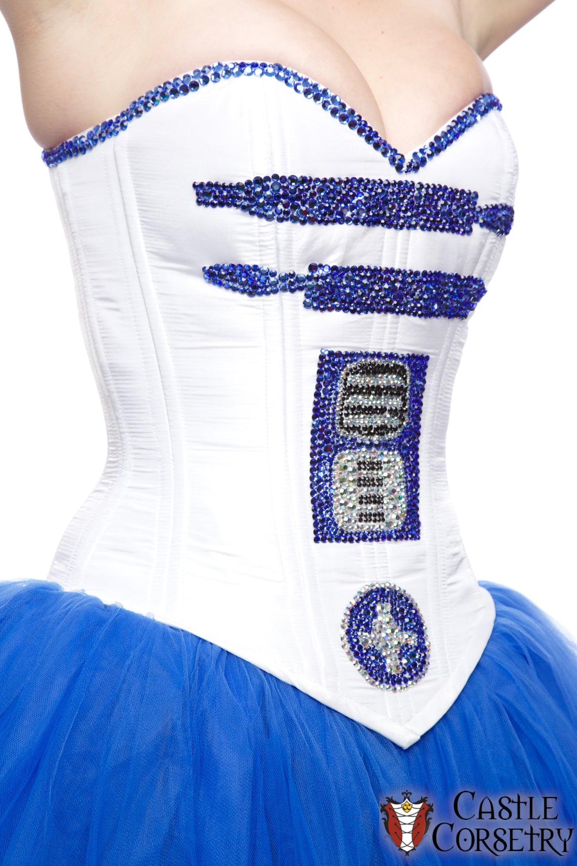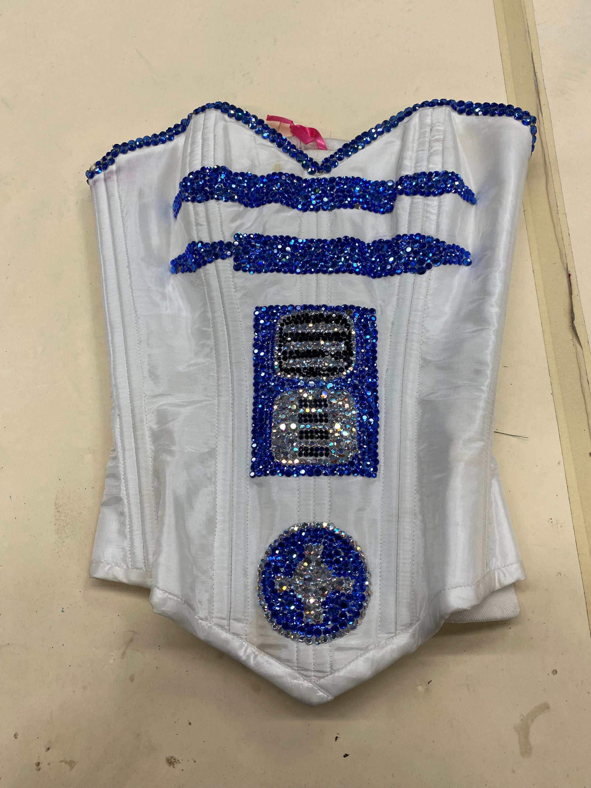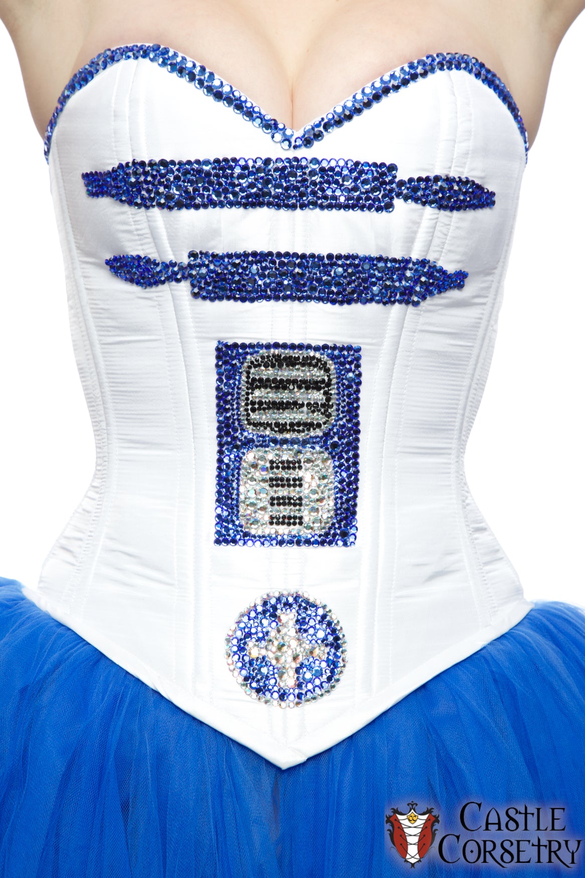 This piece includes Swarovski Crystal R2D2 details on a white taffeta corset. Sold AS IS - there are a few wear-and-tear stains and rhinestones missing, but I can send it with some replacement stones.