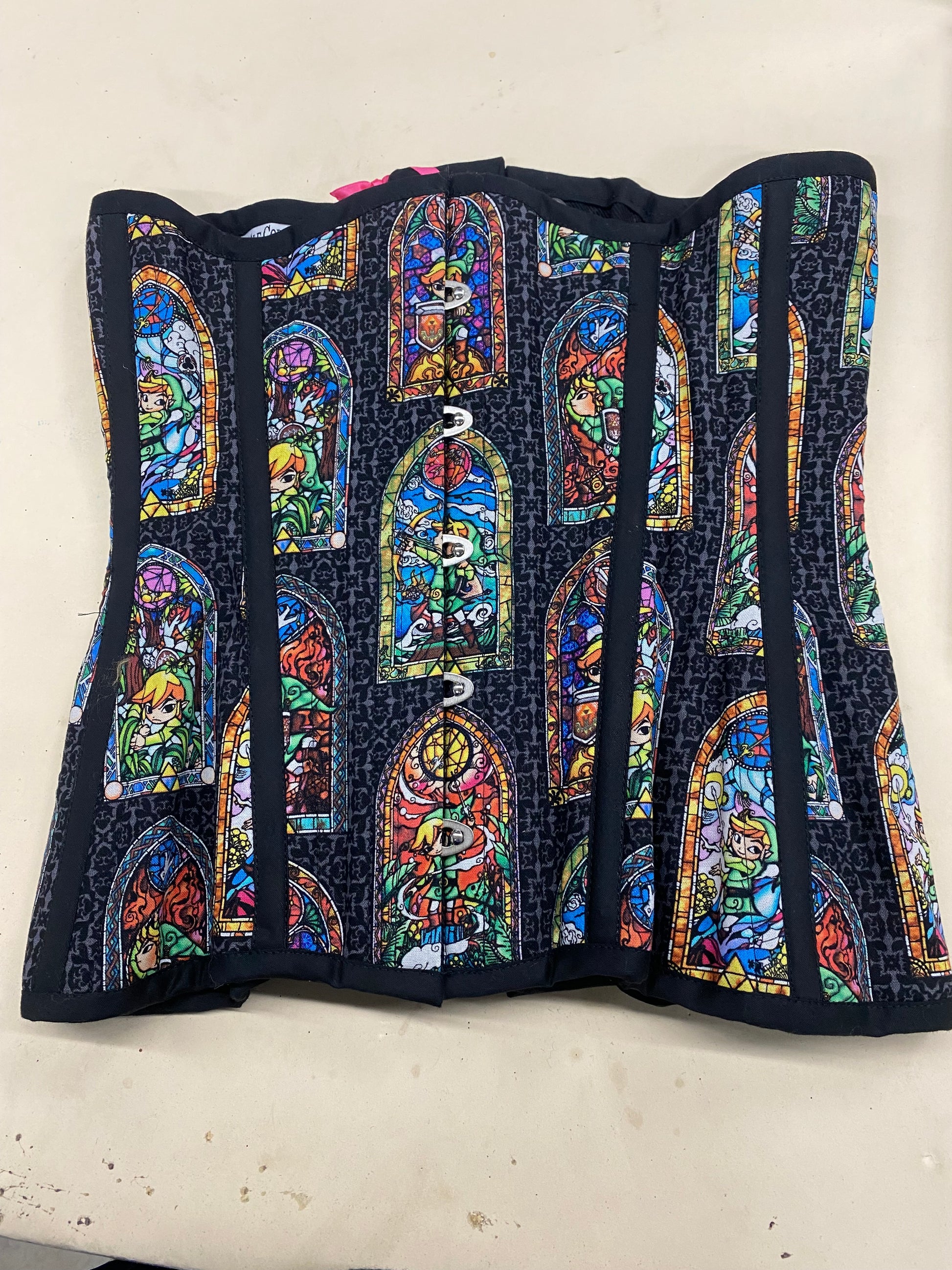 This nerd-tastic corset is a fantastic item to make you the center of attention at the next Comic-Con. This is my best corset for waist training and tight lacing. The pattern cups under your underwire bra and helps lift and support the bust. The waist and hips get shaped all the way down, as the corset comes way down over your hip for a seamless curve. There's a strong steel busk at center front for the wearer's ease, and garter tabs to use for underwear or a sexy look. With 22 total steel bones (double boned at every seam), 10 spring steel and 12 spiral steel, look no further for your waist training needs!