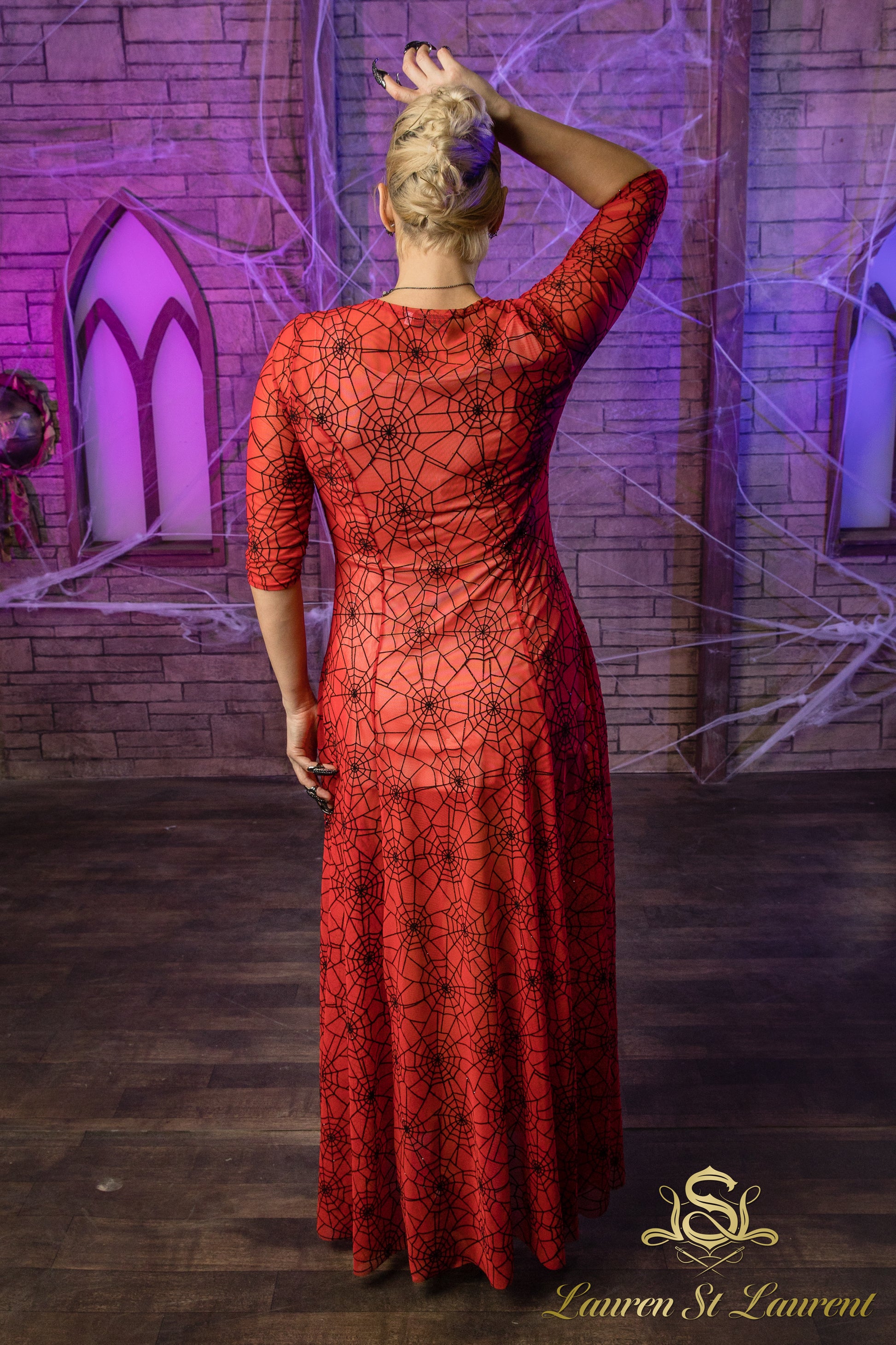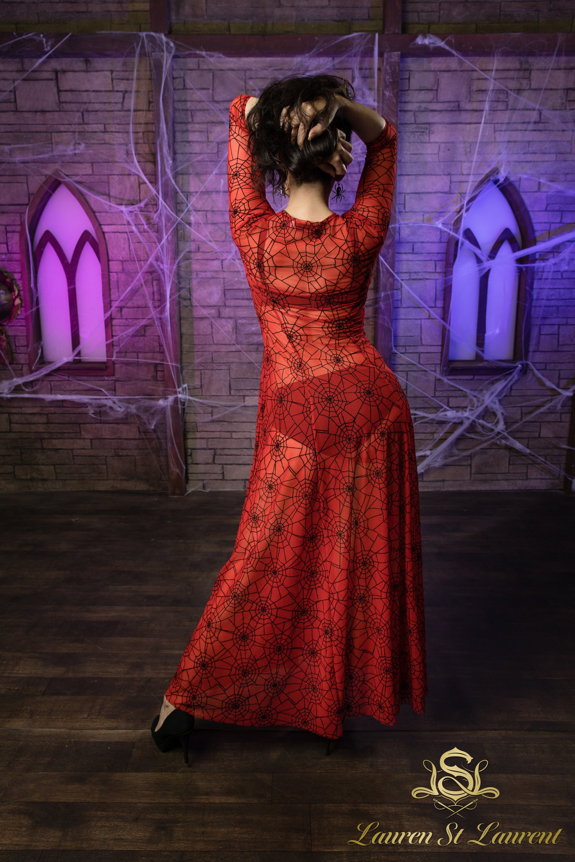 Spooky Maxi Dresses! This one is a double-split maxi, meaning it has slits for both legs! This fabric is moderately sheer, so you can add on a skin tone** or black bodycon slip dress for underneath if you like!