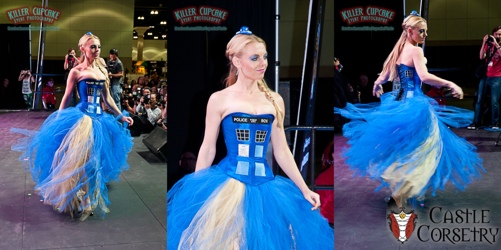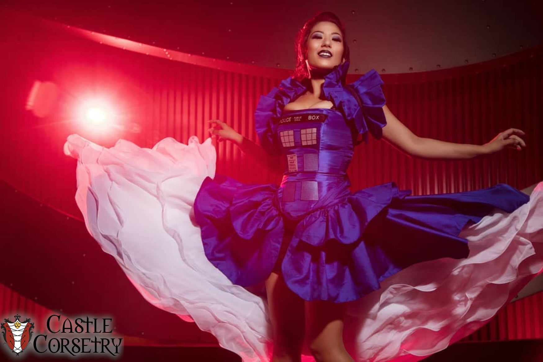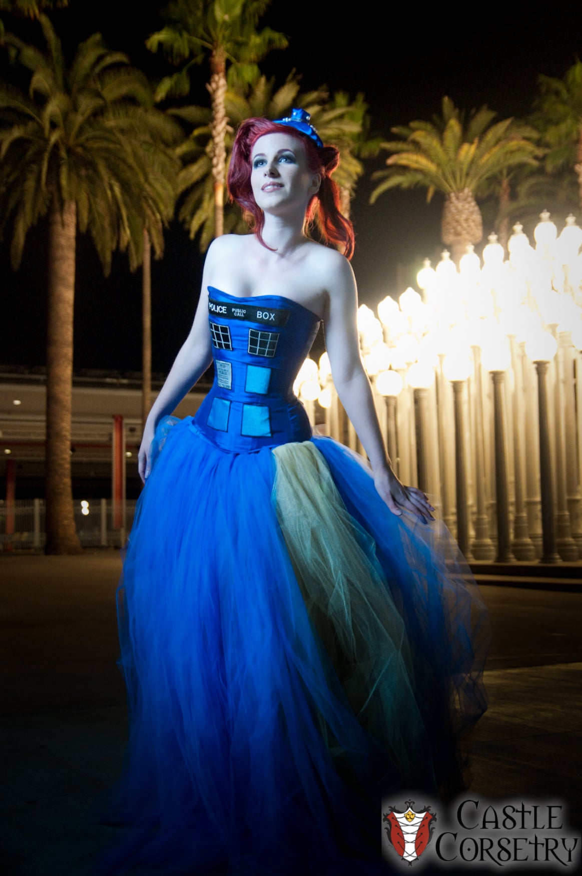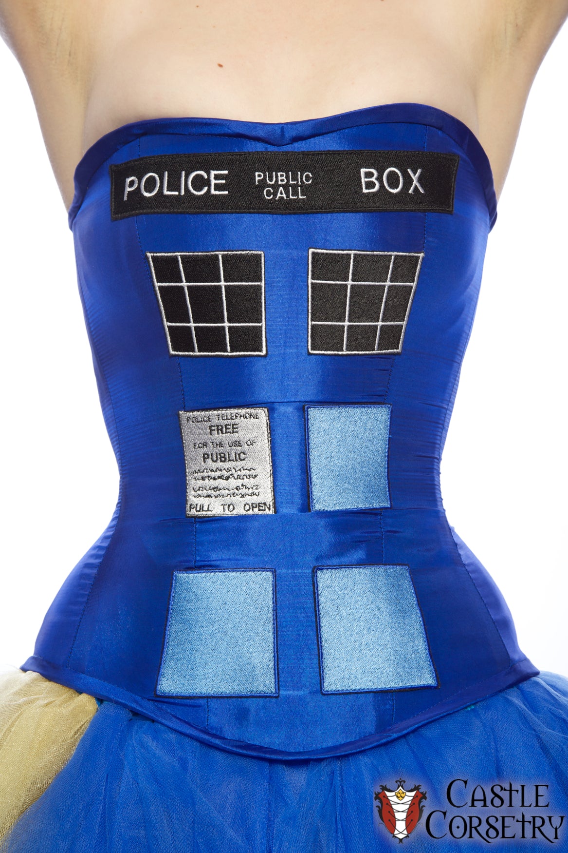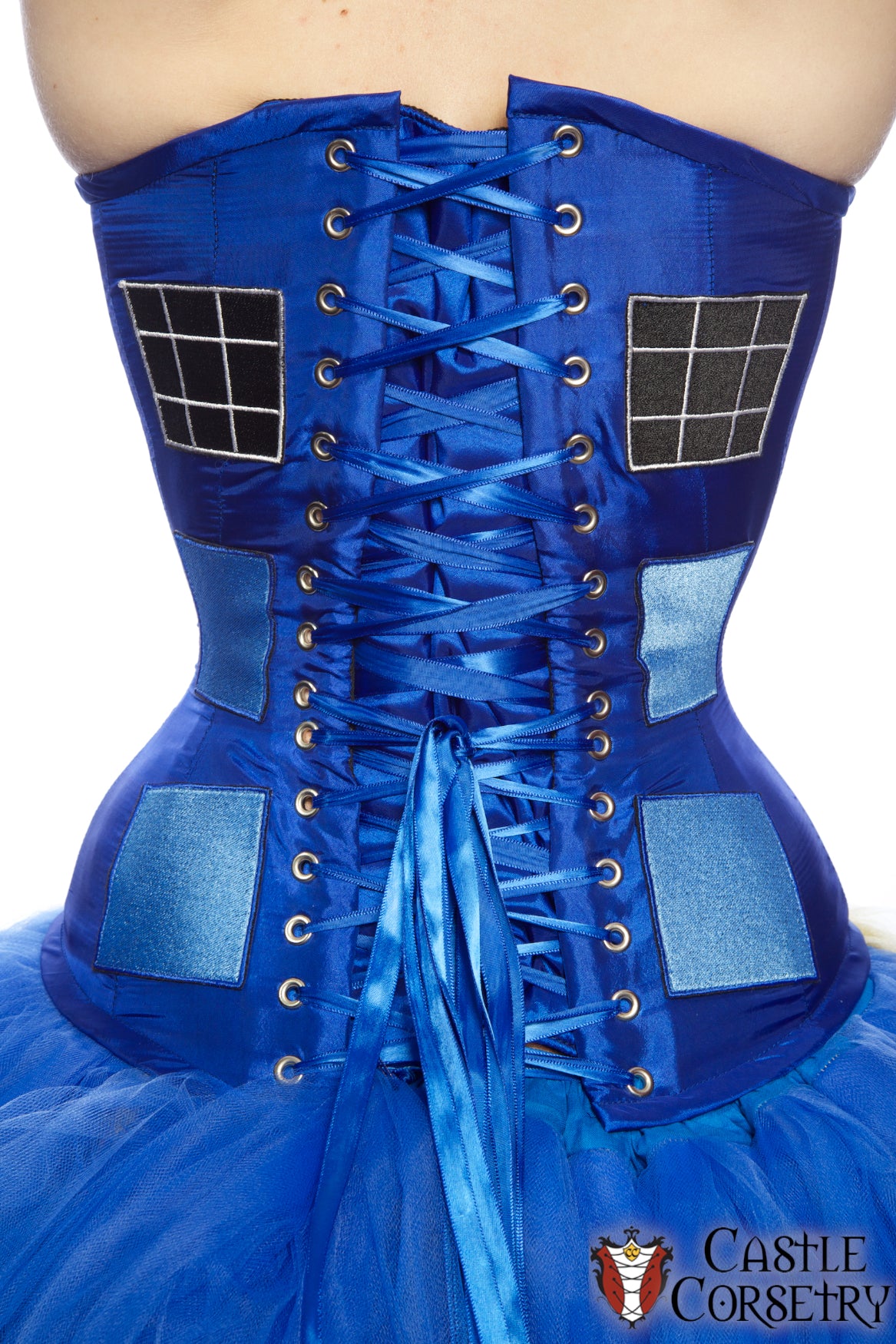 Police Box-inspired corset made from blue taffeta with custom 'window' embroidered patches.